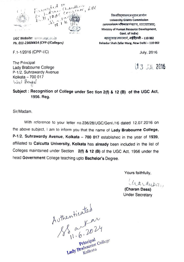Lady Brabourne College is affiliated to the University of Calcutta. Under Graduate Courses in Bengali and English were the first courses to be introduced in 1939.